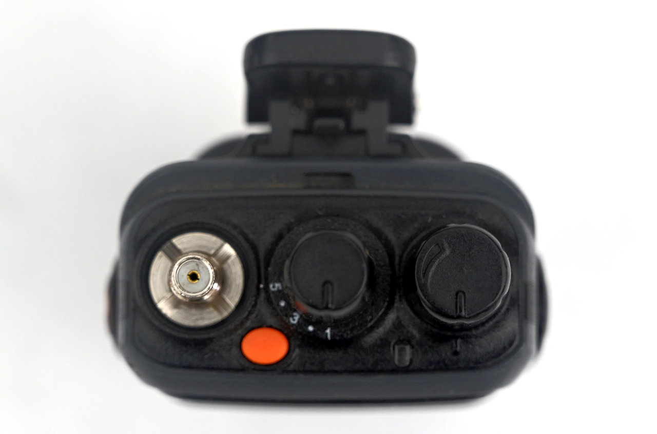 The only buttons you’ll really find on this radio are on the side and one on the top. My only complaint is that the PTT button could use a little more resistance and have a little more of a click to it. This is being kind of nitpicky, as it works very well. On top, you have two knobs, the one on the left allowing you to switch between channels one and five, the one on the right is power and volume. Both of them work excellently.